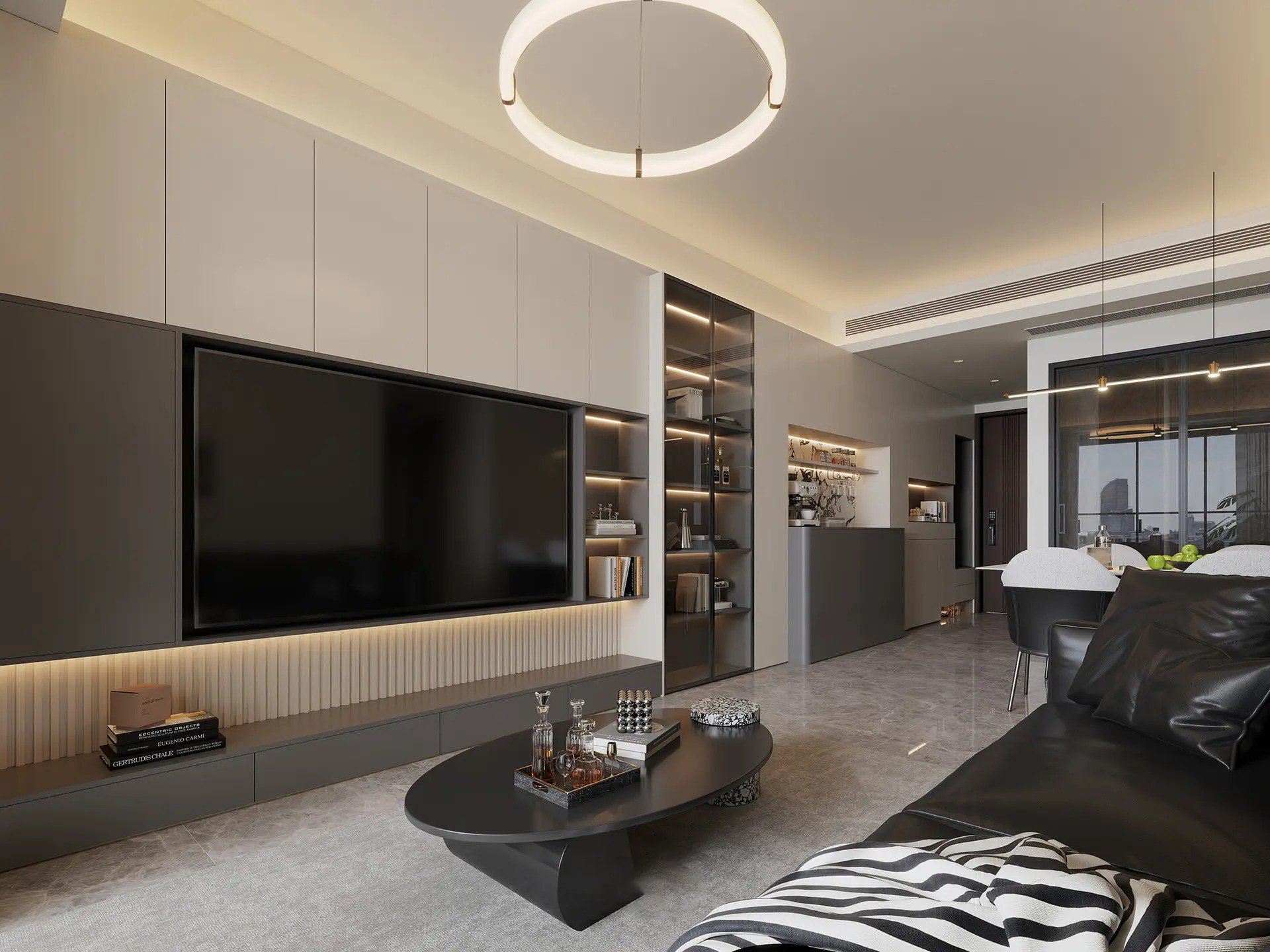 Vách tivi kết hợp kệ, tủ trang trí cánh kính là một lựa chọn thông minh và đầy phong cách. Vừa tạo điểm nhấn cho phòng khách, vừa tối ưu hóa không gian lưu trữ, những mẫu vách tivi này giúp gian phòng trở nên gọn gàng, ngăn nắp hơn. Phần kệ trang trí có thể dùng để đặt sách, cây cảnh nhỏ, hoặc những đồ lưu niệm, tạo nên một không gian sinh động và cá nhân hóa, phần tủ trang trí cánh kính được trưng bày những chai rượu quý.