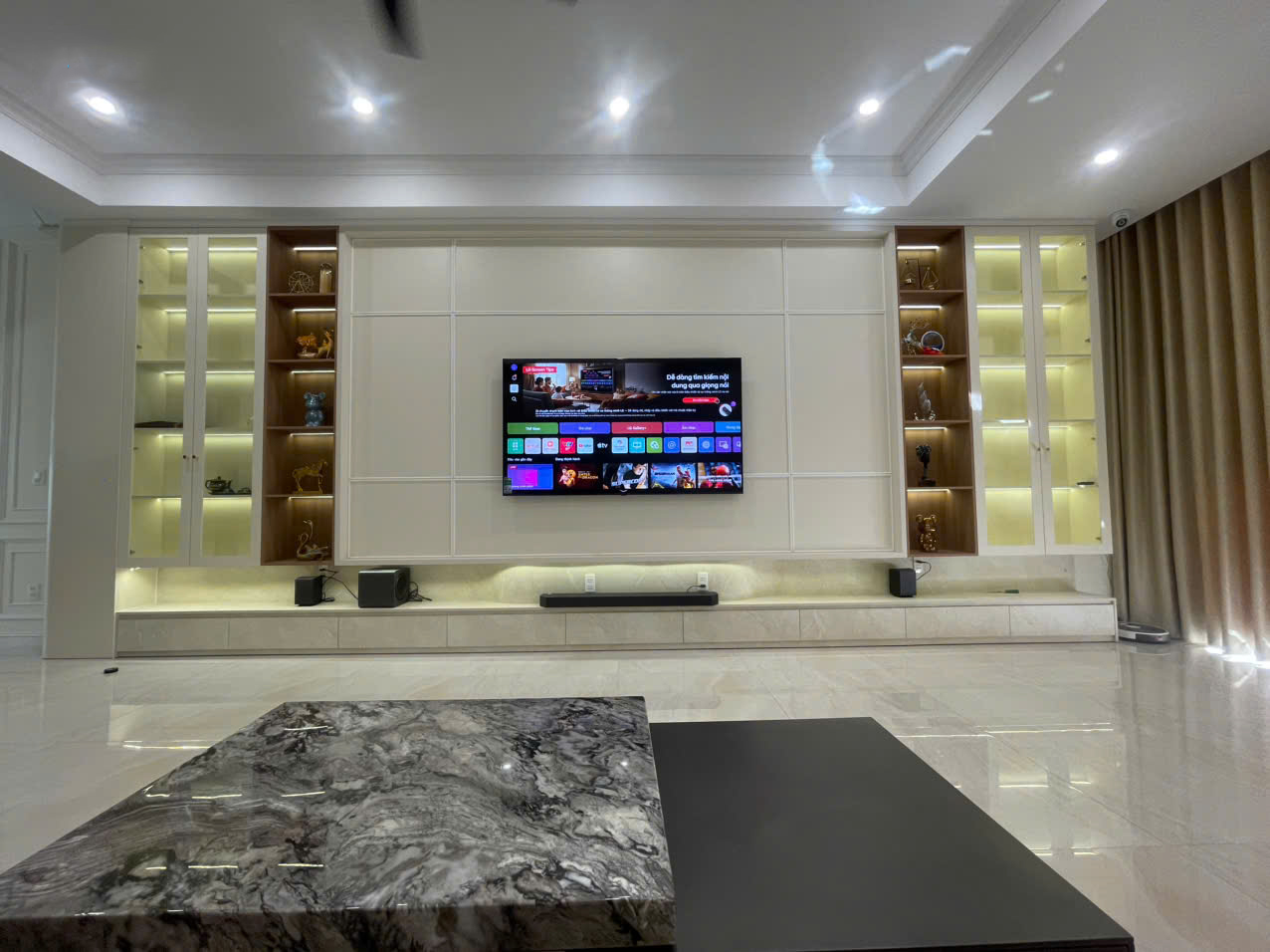 Vách tivi theo phong cách tân cổ điển kết hợp hiện đại được thi công tinh tế, tỉ mỉ, tạo nên một không gian vừa sang trọng, sáng sủa, nhưng vẫn ấm cúng và công năng tiện lợi tới từng chi tiết.