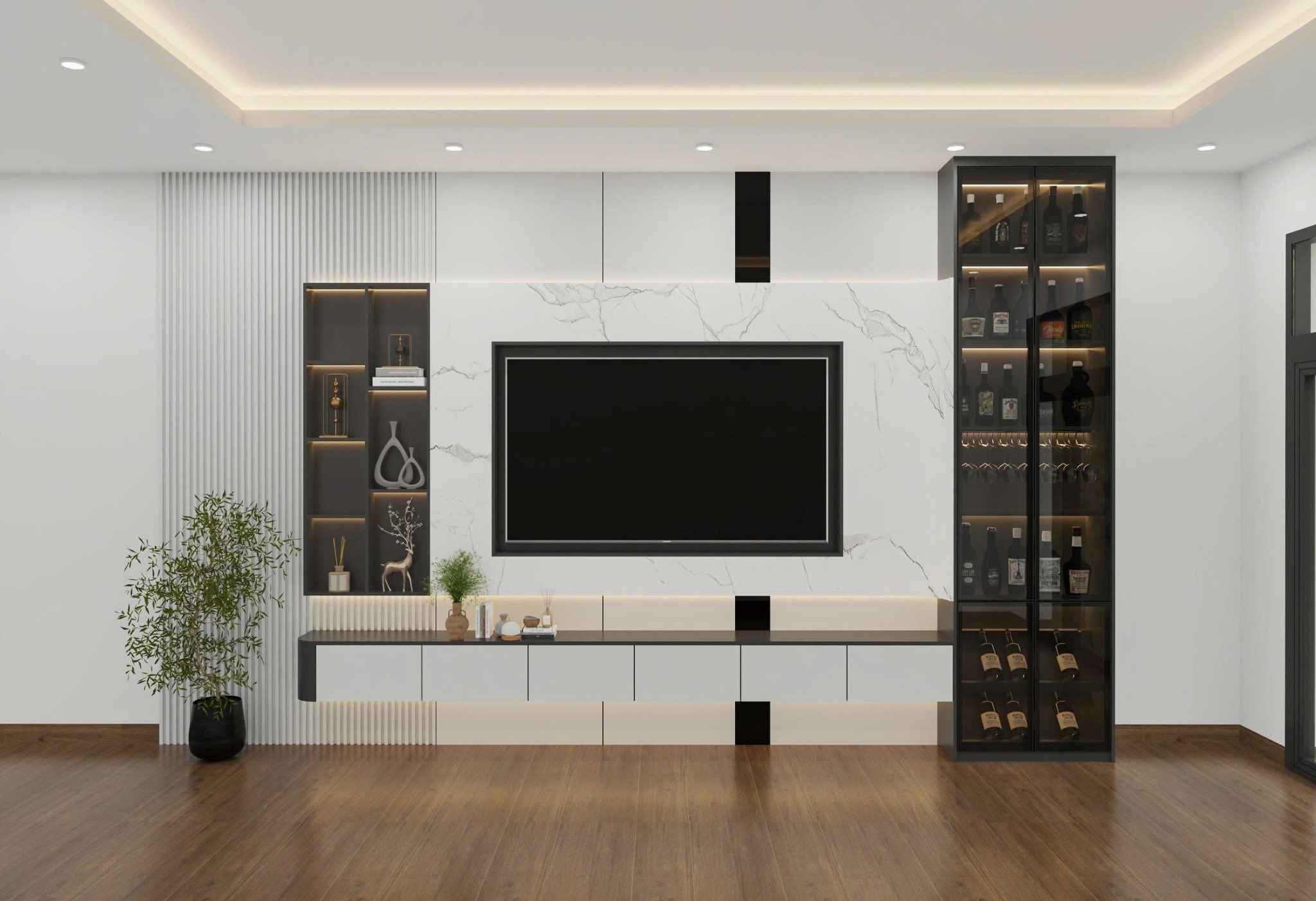 Vách tivi vân đá kết hợp tủ rượu không đơn thuần chỉ là nơi đặt tivi mà đã trở thành tâm điểm nghệ thuật. Một chiếc vách tivi đẹp không chỉ tôn lên vẻ sang trọng cho không gian mà còn giải quyết bài toán lưu trữ thông minh, mang đến sự gọn gàng và tiện nghi tối đa.